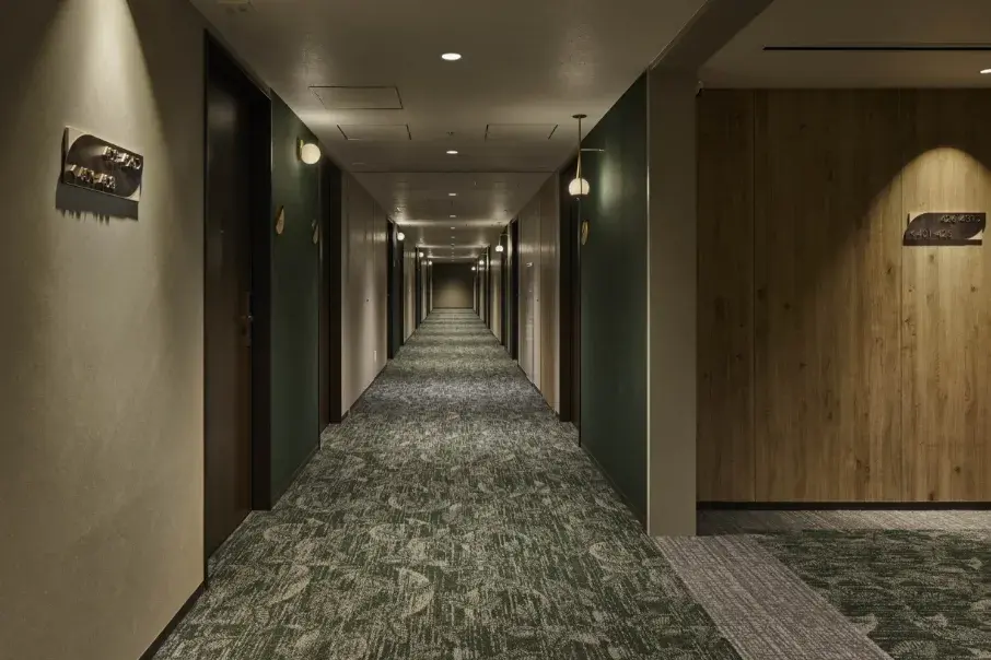 エントランスの吹き抜け部分には植物を模したタイルワークを施し、温室の窓の奥に見える生き生きとした緑を表現しました。また、客室はクライアントからのご要望であった「レジデンシャルライク」のニュアンスをしっかりと咀嚼。複数回の打ち合わせでインテリアムードの方向性を固めることで、客室のデザインに落としこみました。また、コストパフォーマンスを考慮し、自然の木材にできるだけ近いイミテーション材を探すことにも注力しました。
