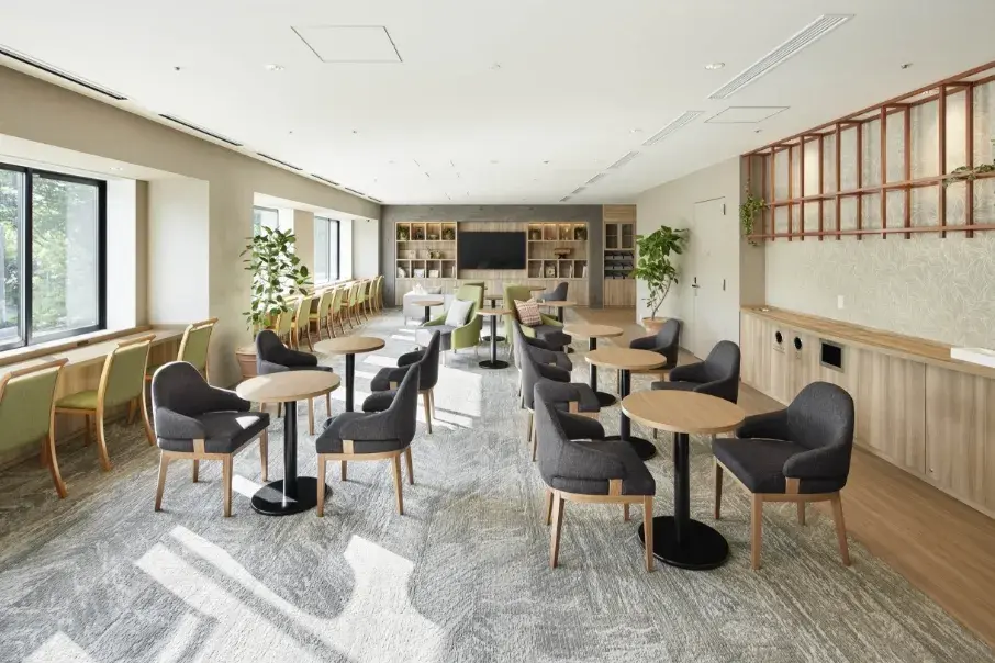 客室はただ滞在するための部屋ではなく、バリアフリーの設備と機能を備え、患者様が安全に過ごせる安らぎの空間に仕上げた。施設全体は<ORANGERY(温室)>をコンセプトに、ゲストに癒しと活力を与えるデザインで、患者様の気持ちに寄り添うことを追求した。