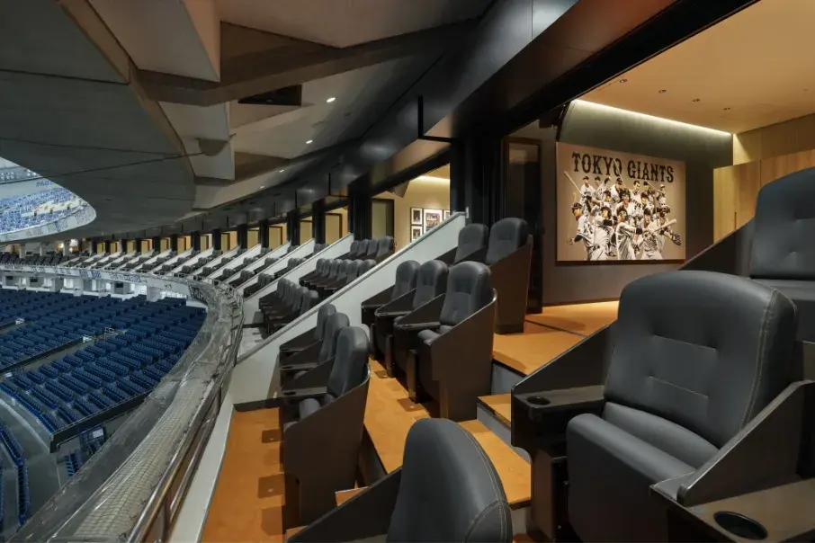 ファサードから特別感が漂う31番ゲートから足を踏み入れると、ラグジュアリーなレセプションエリアがお出迎え。歴代読売巨人軍の優勝カップがディスプレイされ、後楽園球場から東京ドームの歴史を感じられる。VIP ROOMへとつながる廊下には、東京ドームや野球にまつわる貴重な写真の数々が展示され、観戦への期待感を高める。まるで美術館のような上質なデザイン演出は、特別な高揚感を生み出す。